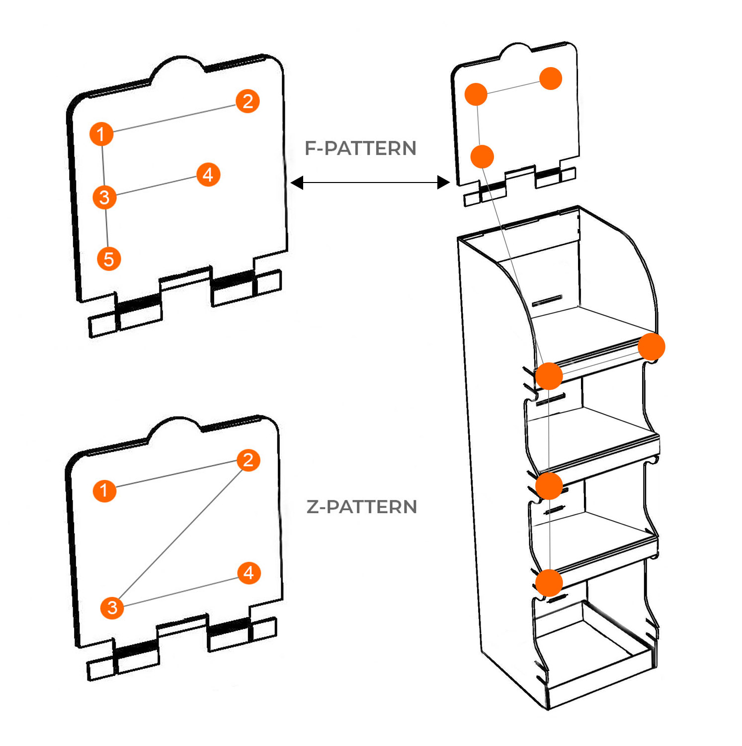 G. Organize your messaging in a pattern that is natural for readers – customers generally scan in one of two shapes, “F” and “Z”, so take advantage of this in your design. Below you can see what this might look like on a display header, but you can apply this rule to the side panels or the front of the display and include the shelf strips as part of the overall pattern.